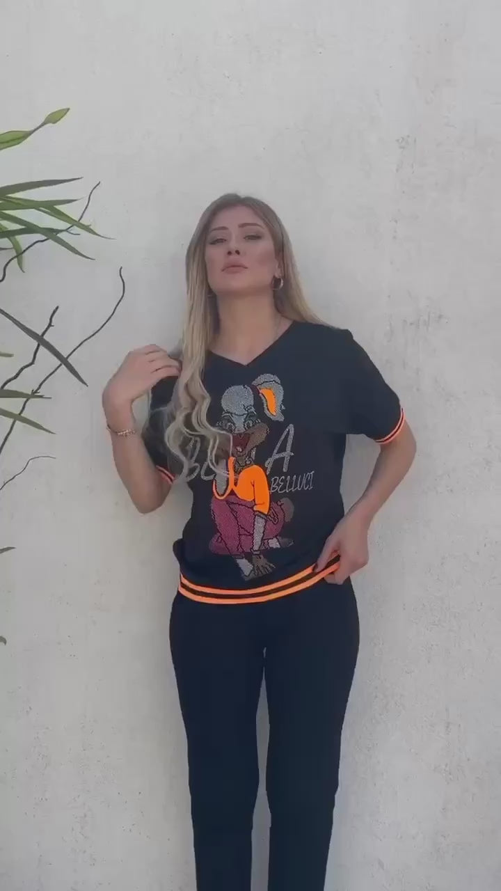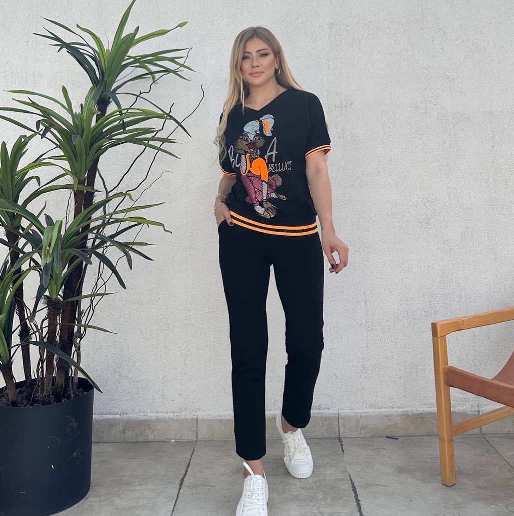 طقم نسائي أسود اللون توب وسروال بأكمام قصيرة مع أحجار في الأعلى.