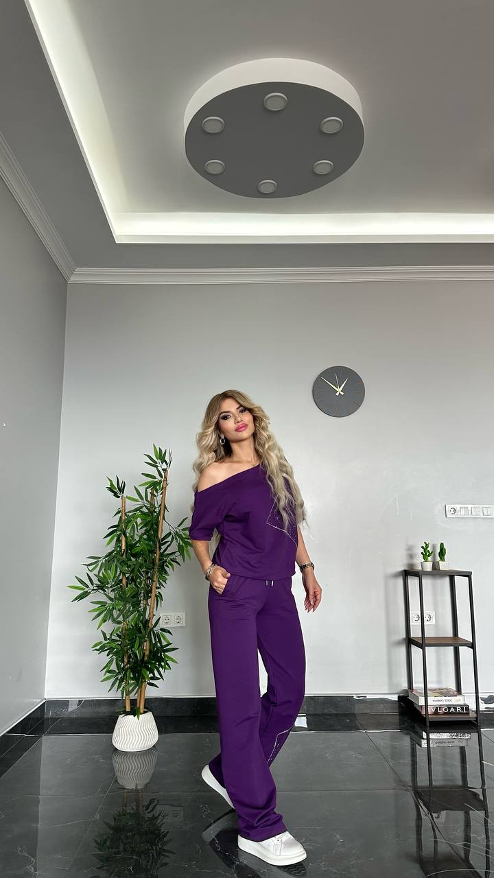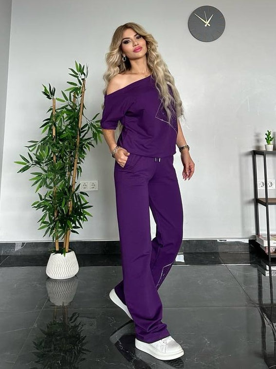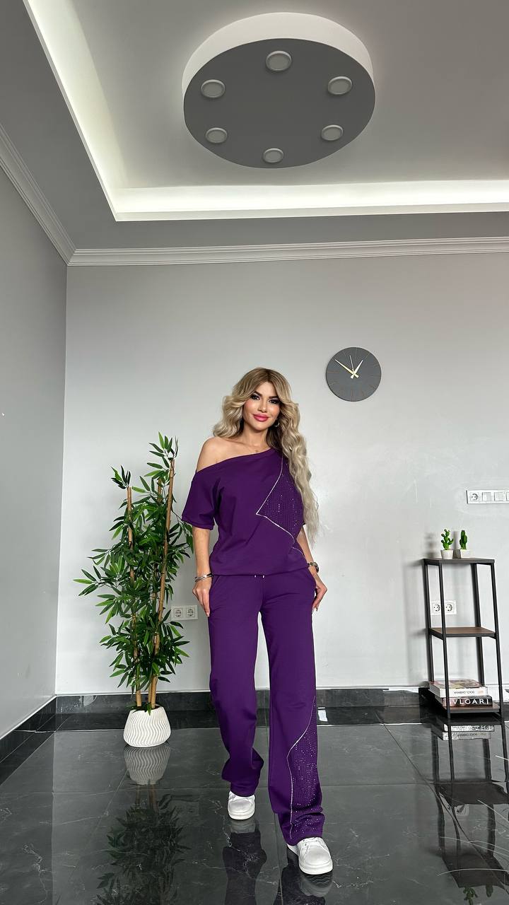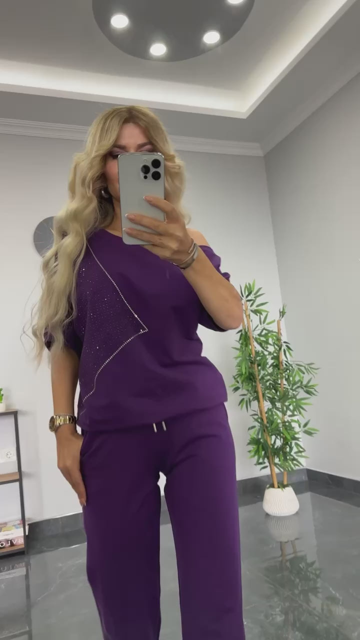 طقم نسائي باللون البنفسجي توب وسروال بأكمام قصيرة مع أحجار في الأعلى والسراويل، وبنطلون واسع من الأسفل.