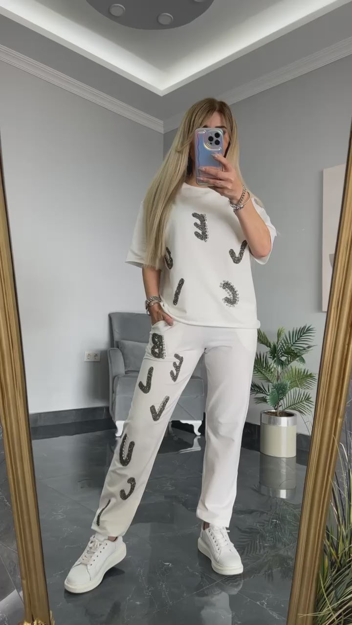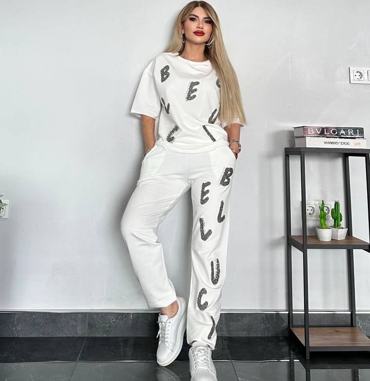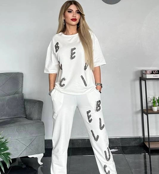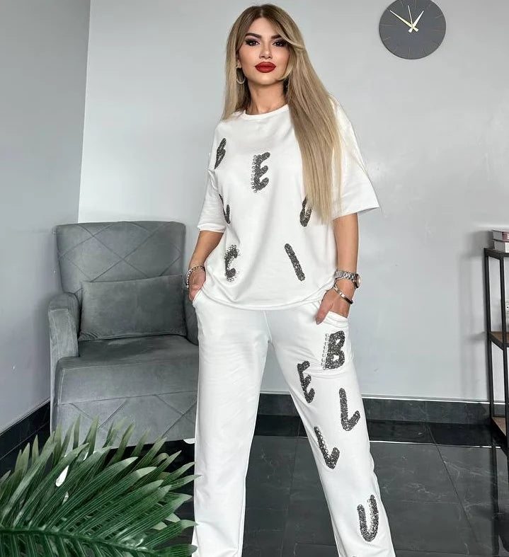 طقم للسيدات باللون الأبيض توب وسروال بأكمام قصيرة.