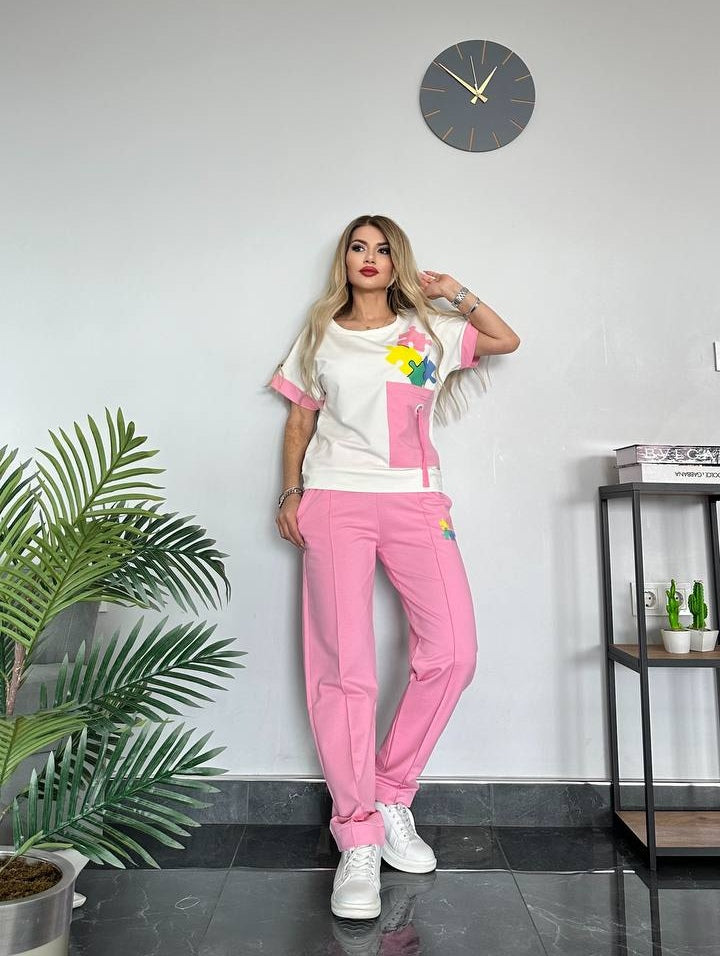 طقم للسيدات باللون الأبيض، توب وسروال بأكمام قصيرة، وسراويل واسعة.