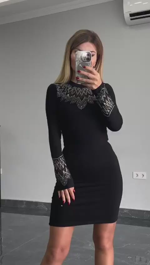 This short women's dress features an elegant and Comfortable Fit, Silver Stone Embellishments on Chest and Sleeve Edges, making it an excellent choice for various occasions and events.