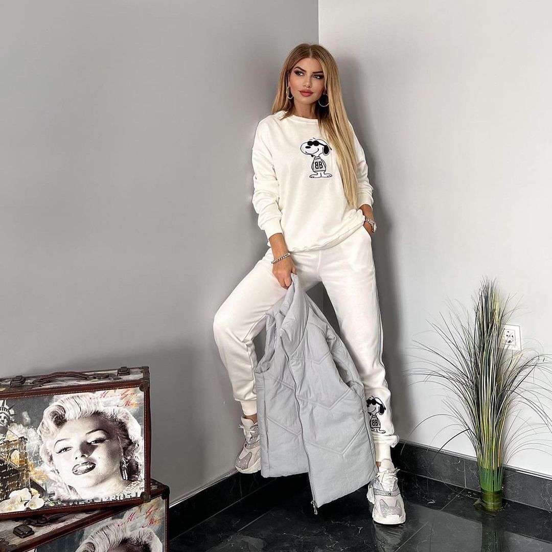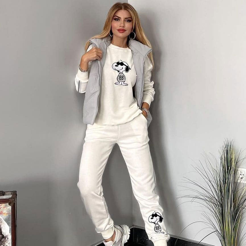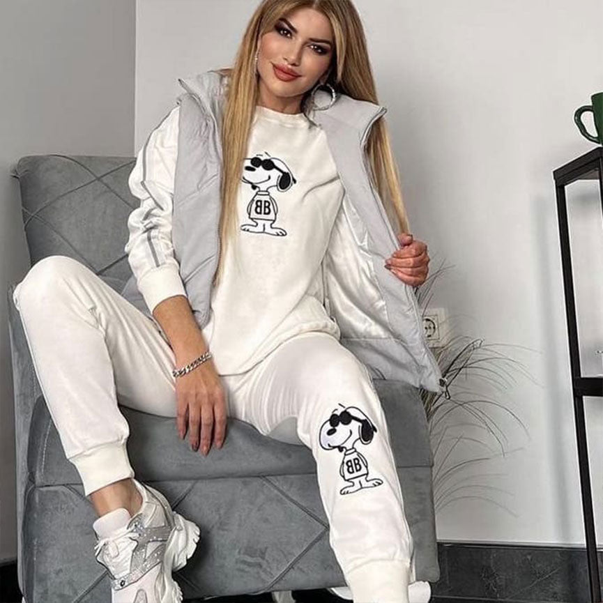 - Design: The coordinated sweater and pants feature an adorable cartoon dog embroidery on the front, adding a playful and charming touch. The puff vest in light gray enhances the overall elegance of the set.