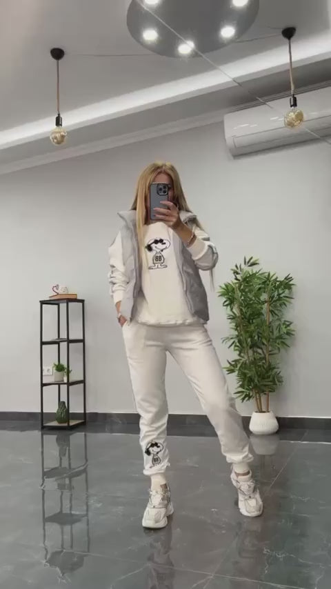 Description: Embrace comfort and style with this elegant women's 3-piece set. The ensemble includes a white cotton sweater, matching pants, and a light gray inflatable vest. Crafted from a blend of 80% cotton and 20% elastane, these clothes provide a perfect balance of comfort and flexibility, making them ideal for strolls and outdoor activities.