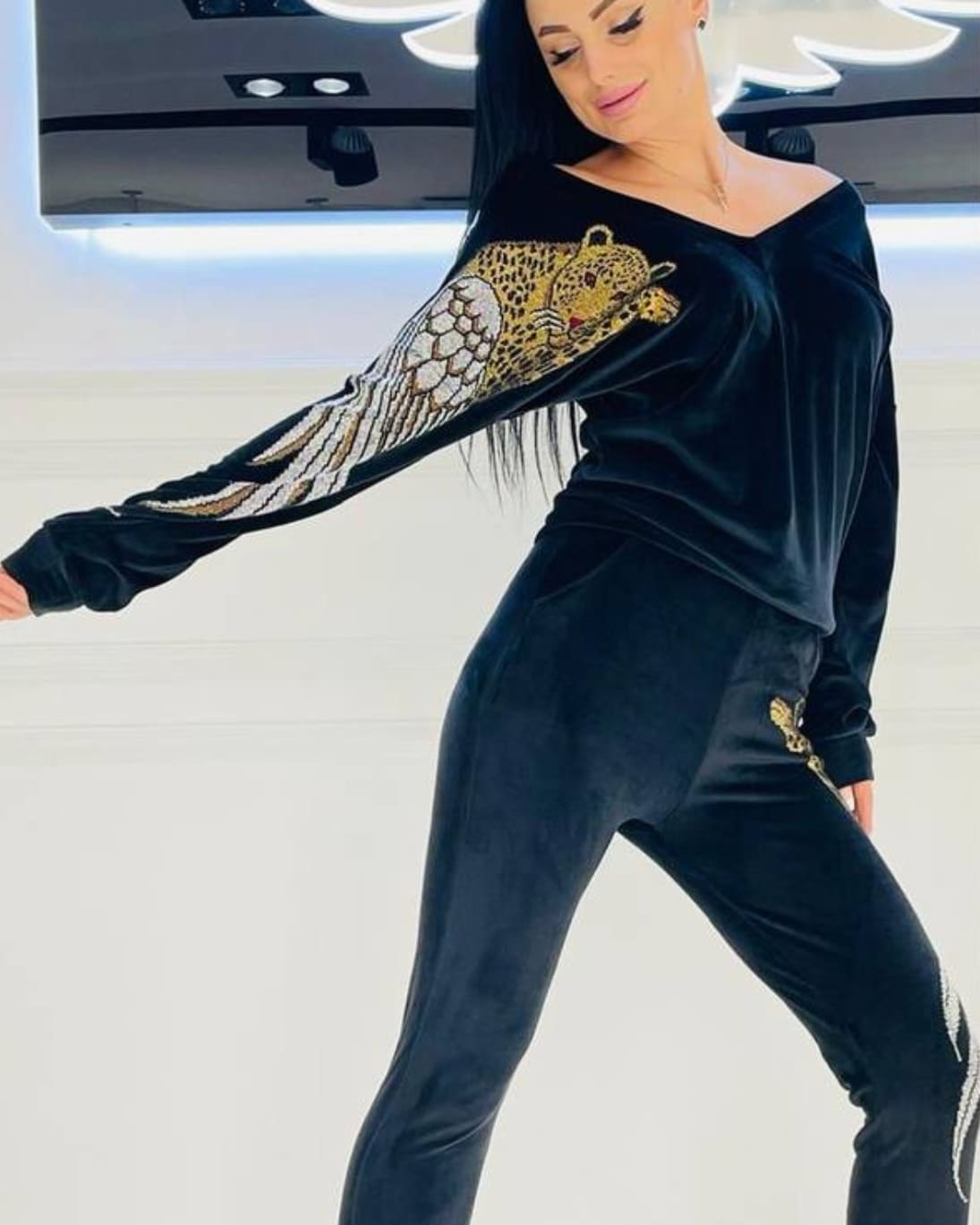 Soft polyester velvet with leopard design studded with stones on the front of the top + spandex, comfortable and soft clothes. -