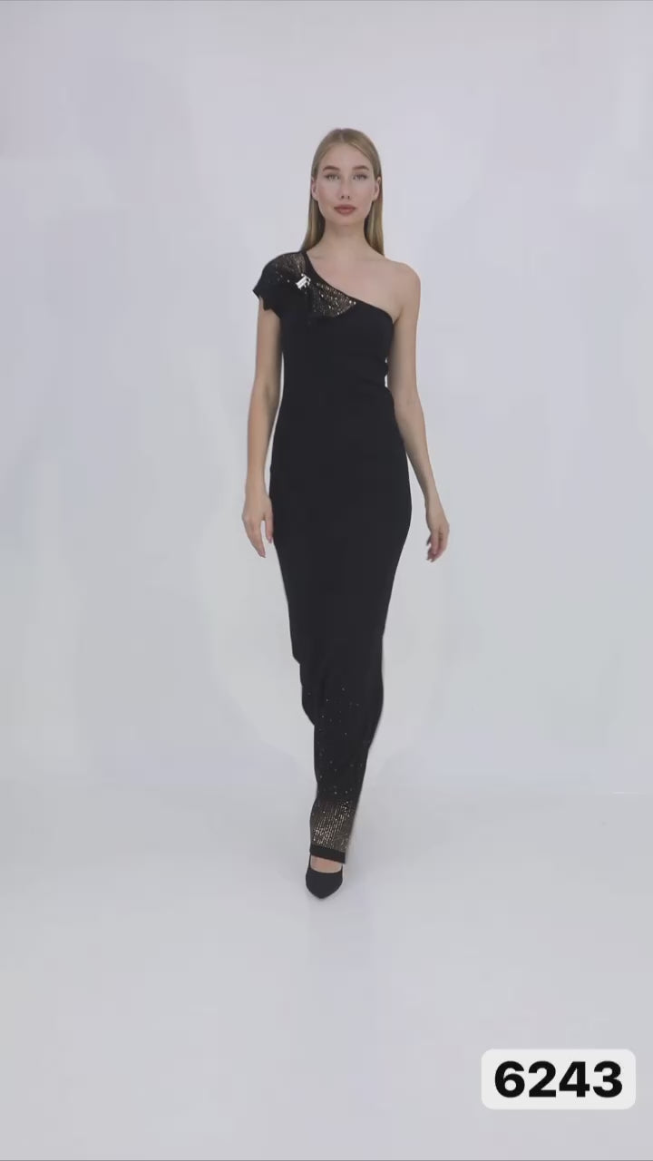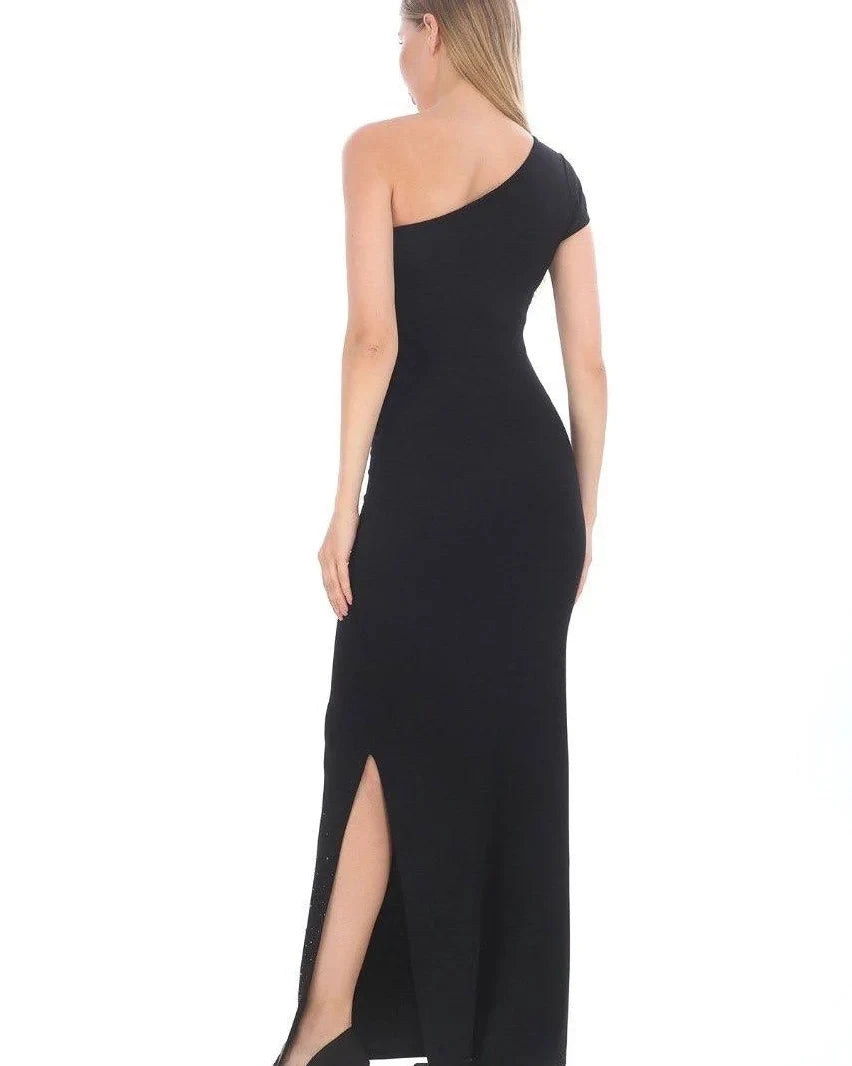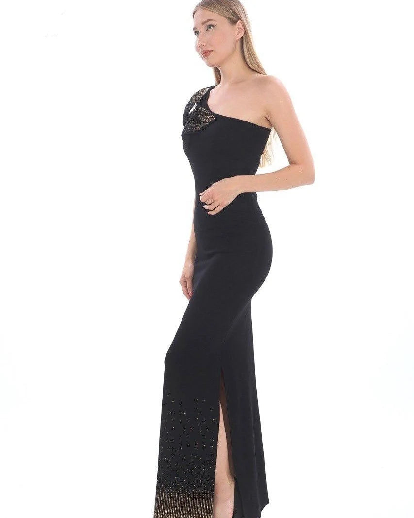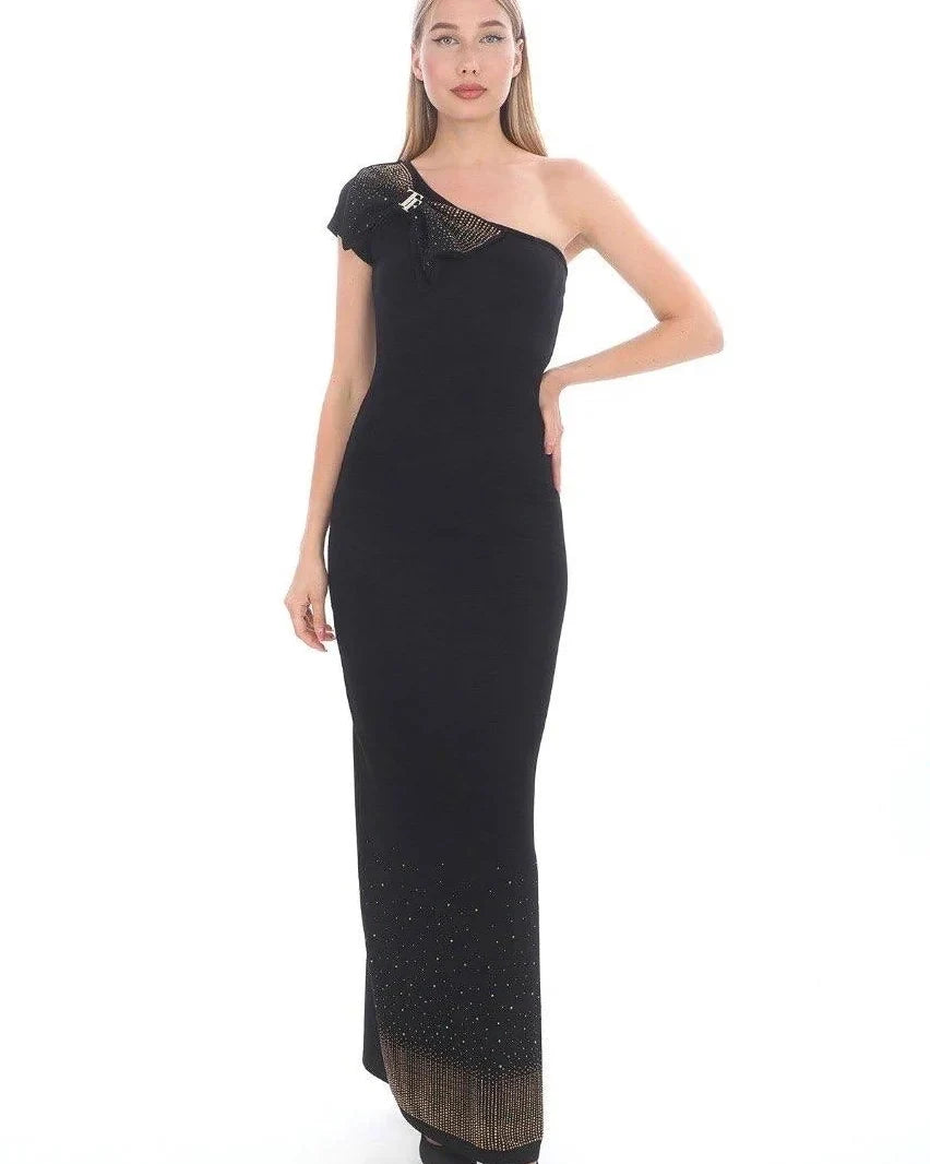 This stunning black dress features a single shoulder design, adorned with a knot embellished with gold-colored stones, adding a touch of elegance and sophistication. Made from a blend of materials, including 63% cotton, 30% polyester, and 7% spandex, the dress offers both comfort and style.