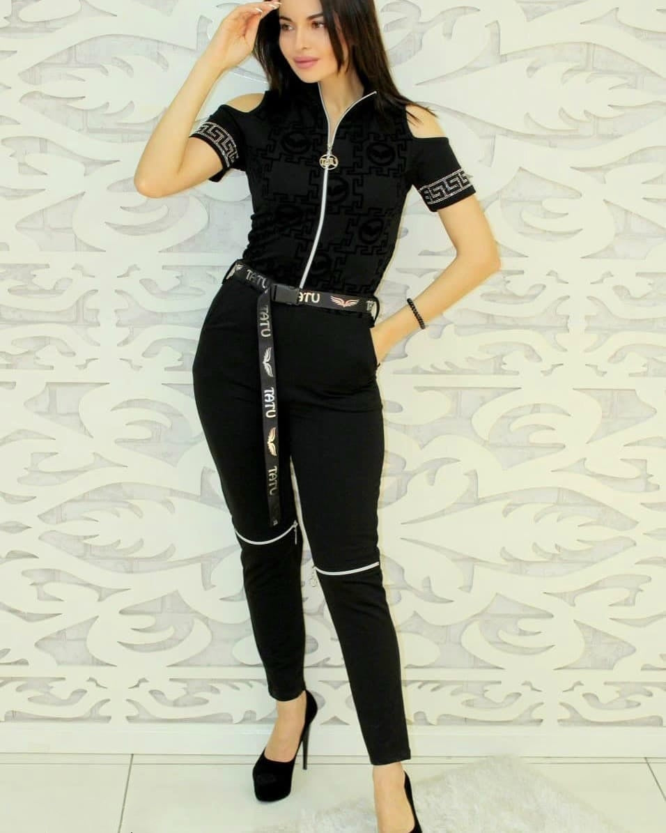 This stylish women's jumpsuit in black features short sleeves adorned with silver-colored stones, shoulder cutouts, and zipper details from the knees. It's beautifully designed, elegant, and comfortable, made from a blend of cotton and polyester