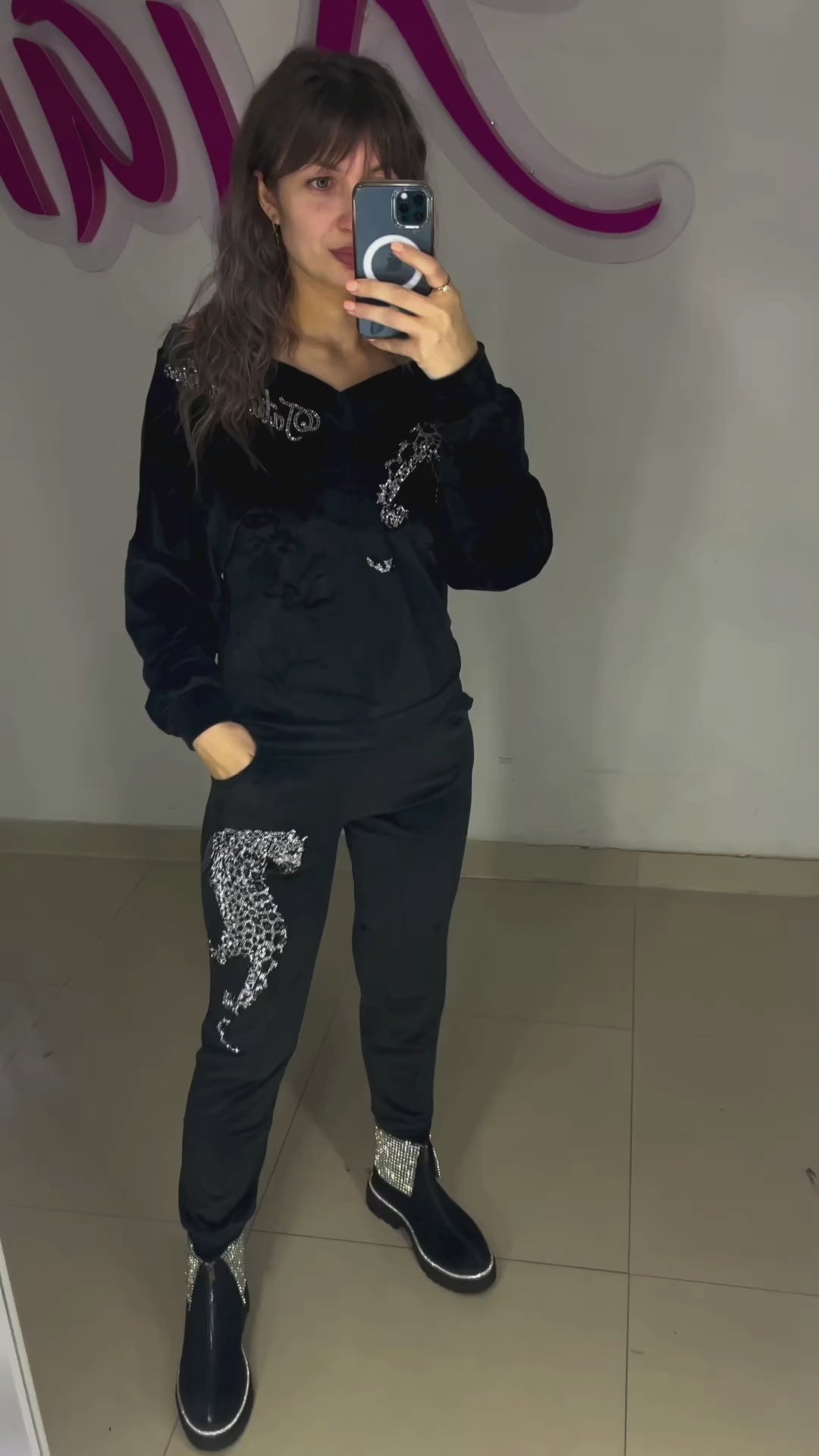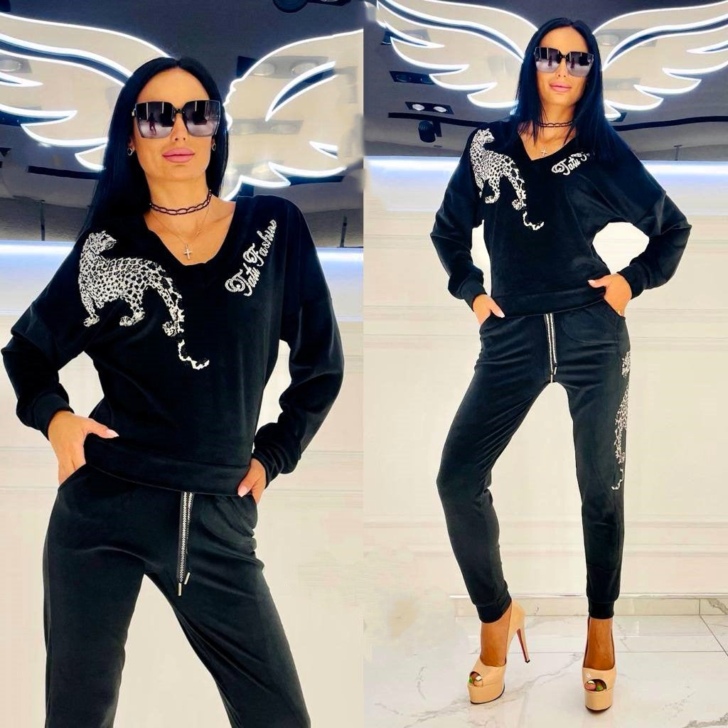 Soft polyester velvet with leopard design studded with stones on the front of the top + spandex, comfortable and soft clothes. -