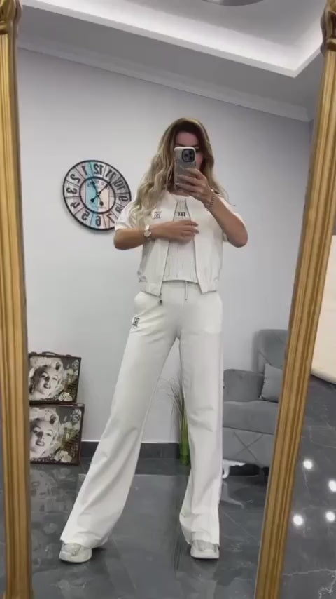 Women's white casual set of 3 pieces with wide pants, a sleeveless top, and a half-sleeved jacket